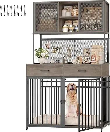 71" Tall Dog Crate Furniture, Indoor Kennel with Hutch, 42" W Dog Cage for Large/Medium Dogs, Wood Crates with 2 Storag